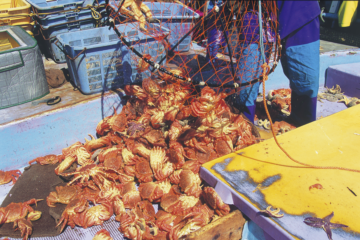 毛蟹の水揚げ日本一を誇る枝幸町の毛蟹かご漁は、流氷明け(海明け)の3月中旬から5月中頃まで。オホーツク海に面した58キロの長い海岸線の沖に漁場があり、3つの漁港に水揚げします。採捕が禁止されているメス蟹と甲長8センチ未満のオス蟹は、船上から海に還します。厳しく選別して資源を大切にしています。